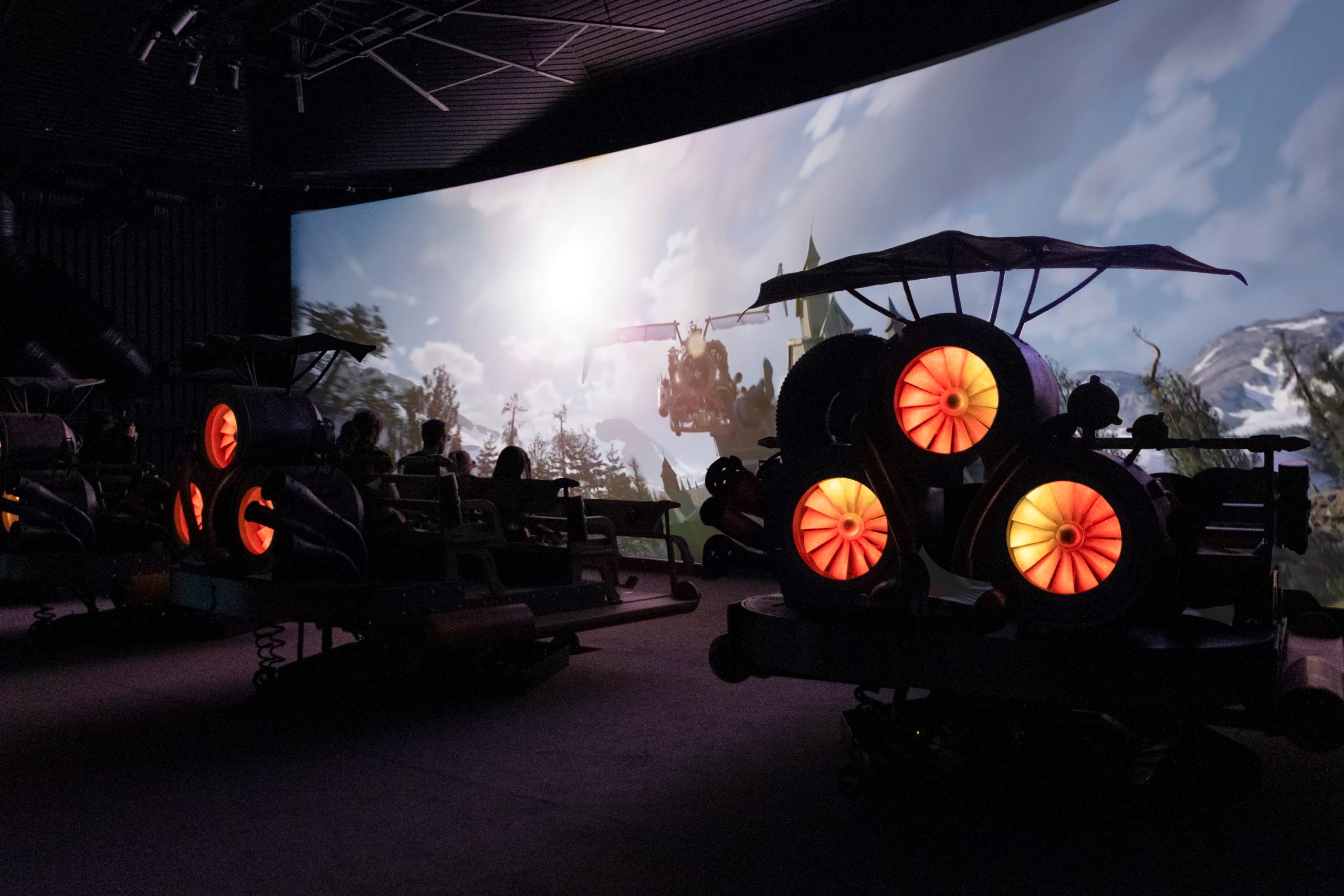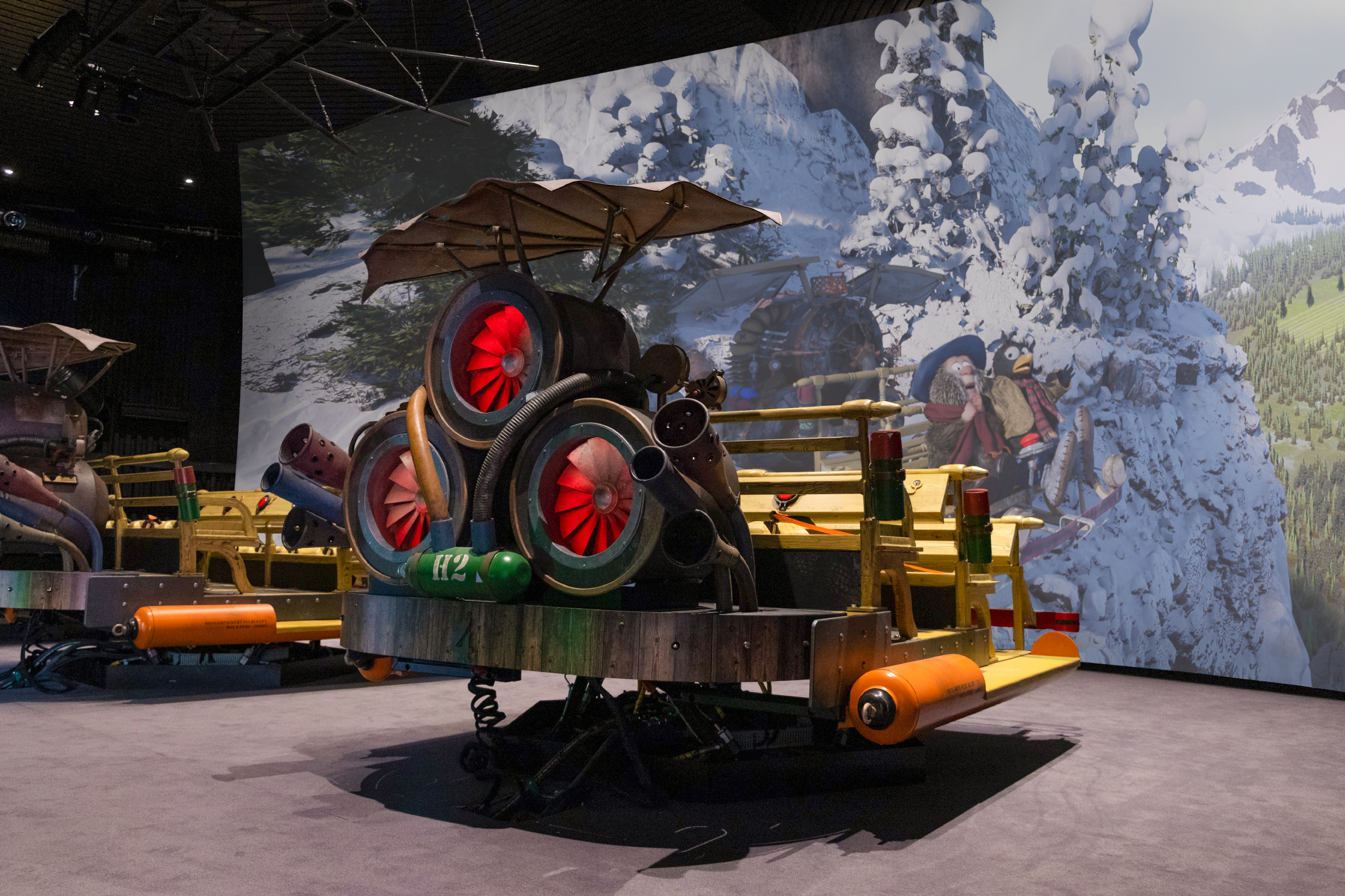 Consisting of four, 8-seater, Stargazers which utilise 6DOF motion simulators, allow for a wide variety of movements – making the ride both smooth and adrenaline-inducing. In front of a large, curved screen at 16 metres widescreen, the vehicles, with steampunk-inspired theming, are designed to look like Reodor’s Hyperakselerator from the story and combine old and traditional elements to resemble something of a snow sleigh with a high-tech upgrade. The ride itself lasts approximately 5 minutes in total with each Stargazer fitted with on-board special effects including water spray, wind and leg ticklers, to enhance the story’s realism.