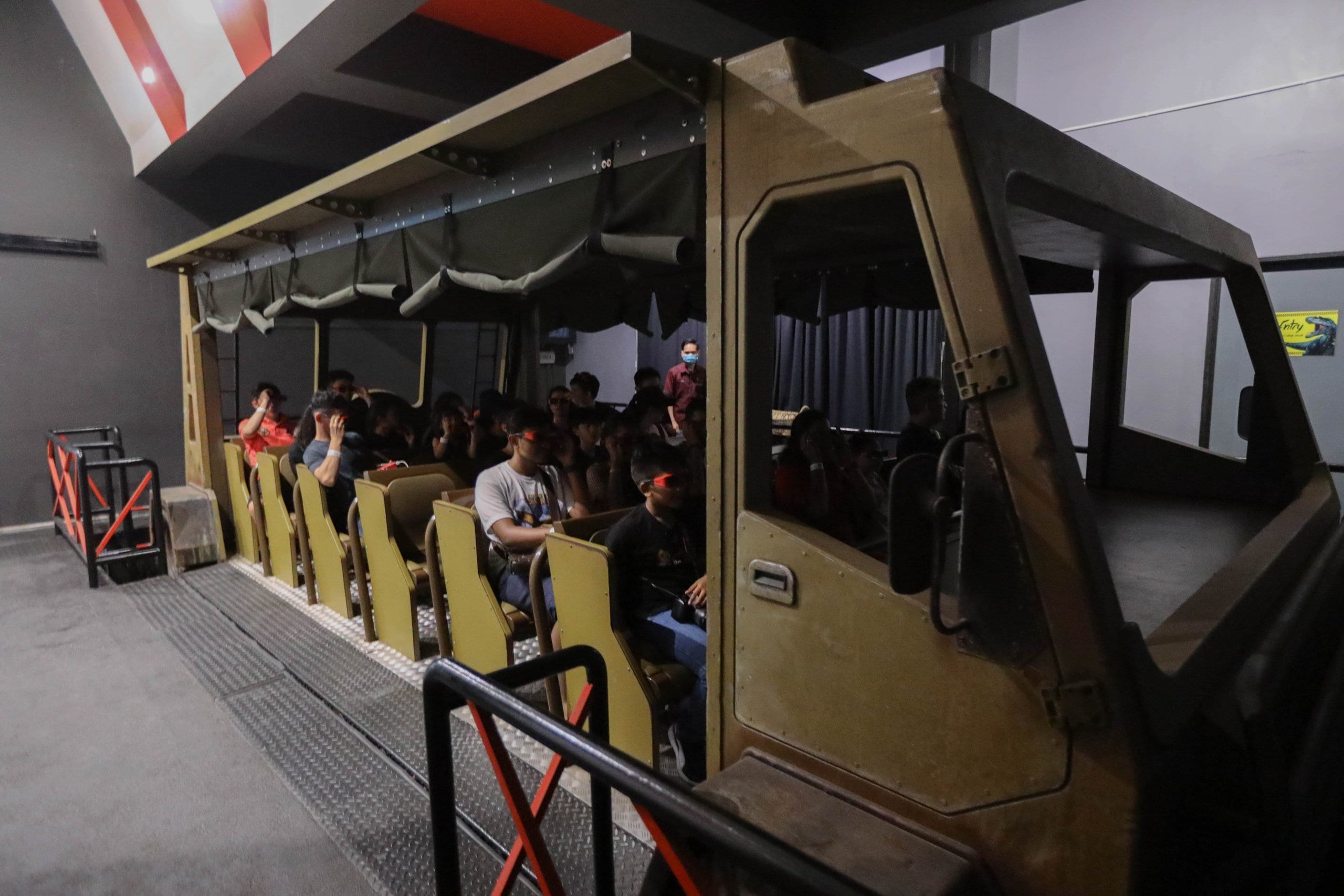 After entering the SkyRex, visitors take their seats on a jeep styled simulator, which after a short journey along a track into the main show area takes them, and are taken on a 5-minute fun-filled journey which at Panorama Langkawi is dinosaur-themed.
